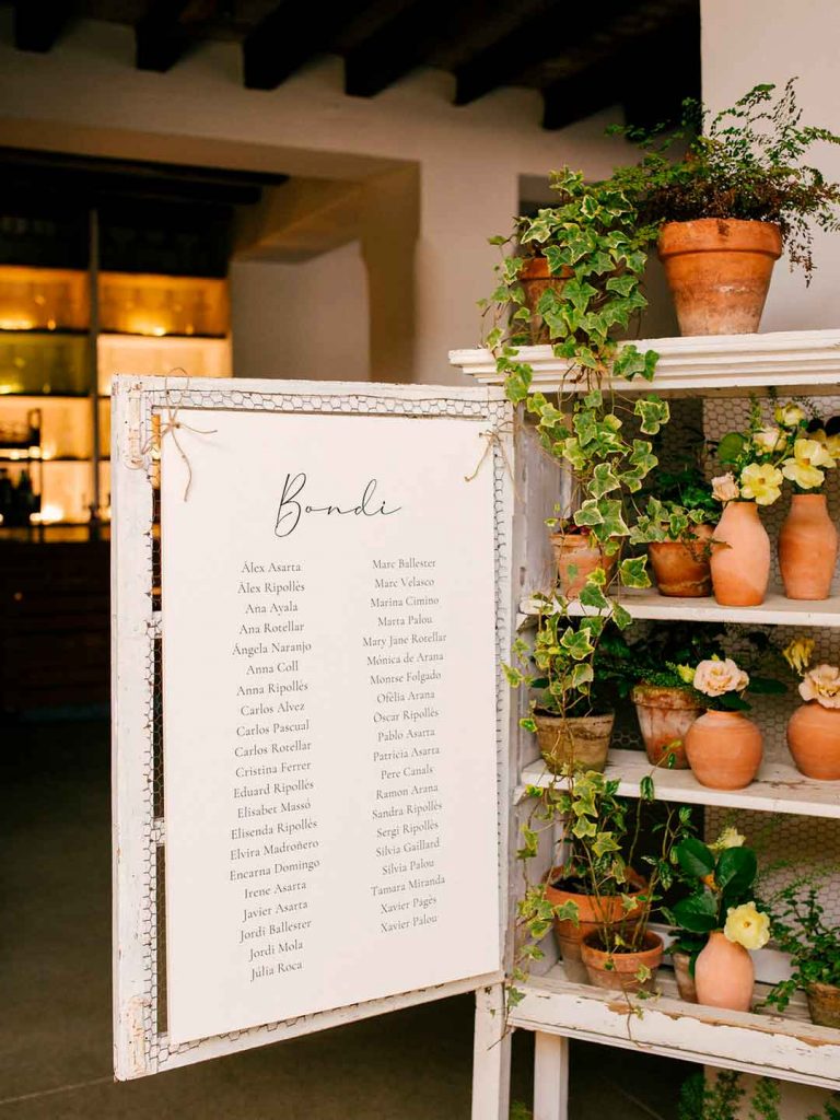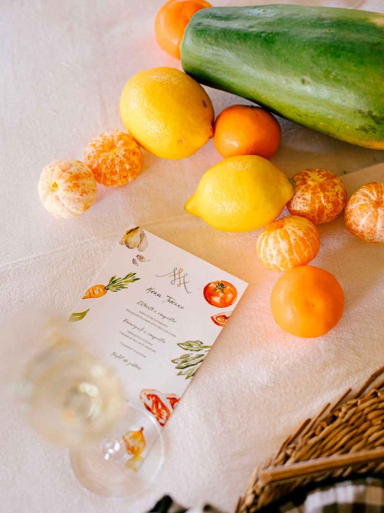 La composición floral para esta celebración en La Roureda fue vibrante y generosa: flores de temporada en tonos intensos combinadas con frutas frescas, creando un efecto visual muy rico y orgánico. Las bases, los colores, las texturas… todo hablaba de una primavera exuberante, alegre y sofisticada. Y para darle aún más vida al espacio, diseñamos una decoración aérea verde que enmarcaba la escena y le daba un carácter casi teatral, vistiendo el ambiente con movimiento y profundidad.