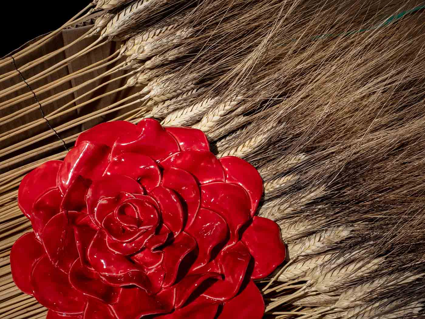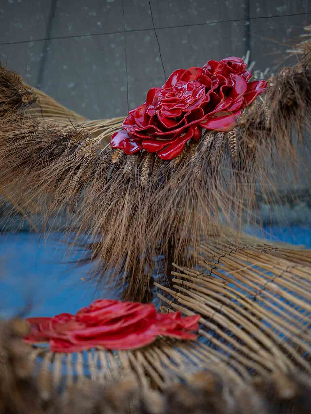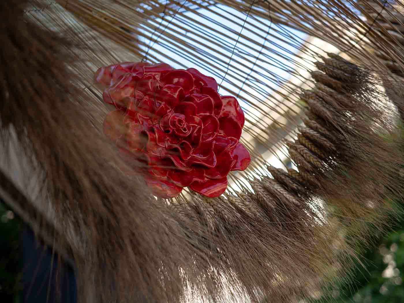 Las rosas cerámicas hechas a mano por ofrecen el contrapunto perfecto: un estallido de color y textura que dialoga con la espiga de trigo, pero también incorporando otro aspecto artesanal relacionado con Barcelona. La combinación de material y lenguaje valida el trabajo hecho a mano y la conexión con el terreno local.