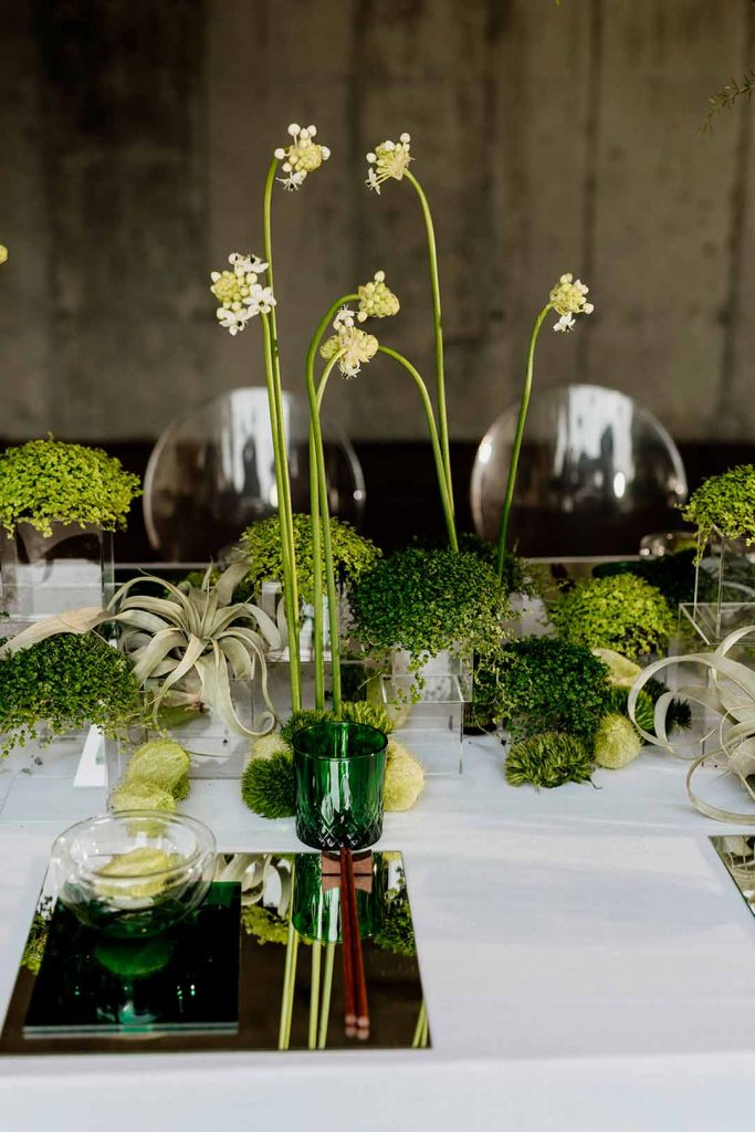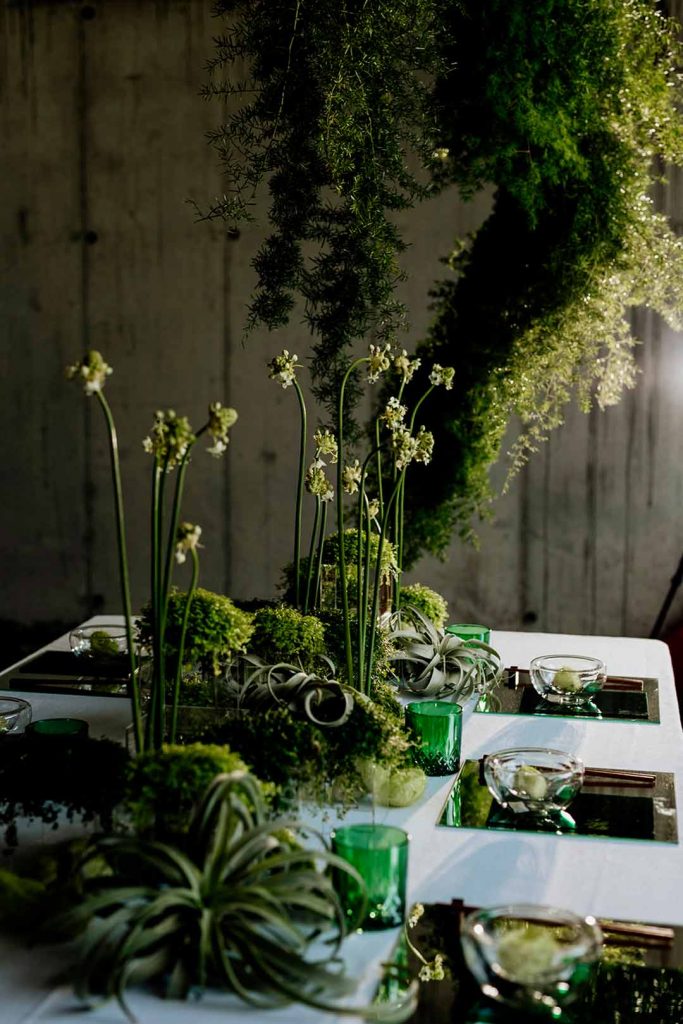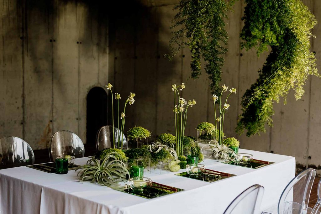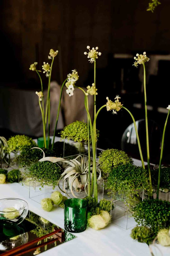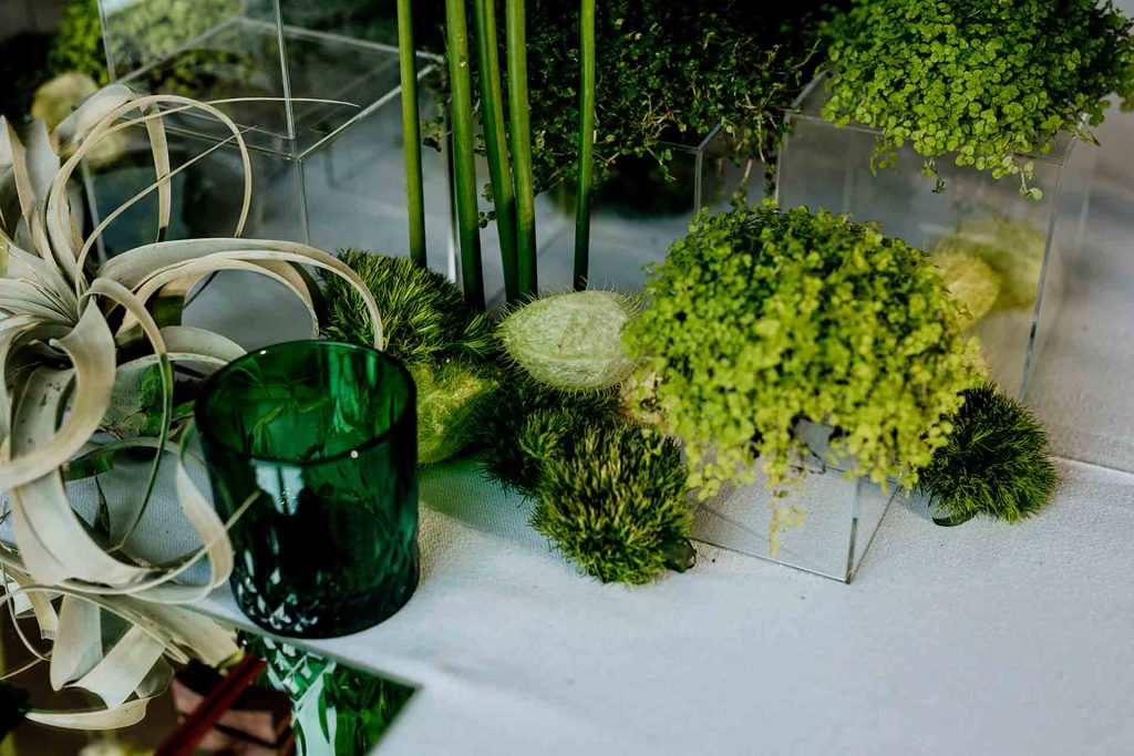 Las composiciones verdes, frondosas y de inspiración húmeda, aportan volumen y textura sin perder la esencia minimalista que define esta propuesta.