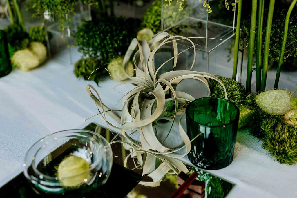 Este shooting es mucho más que una decoración; es una experiencia sensorial pensada al detalle. Cada elemento —desde el cristal y el metacrilato hasta el frescor de las plantas naturales— ha sido seleccionado para transmitir ligereza, frescura y modernidad.