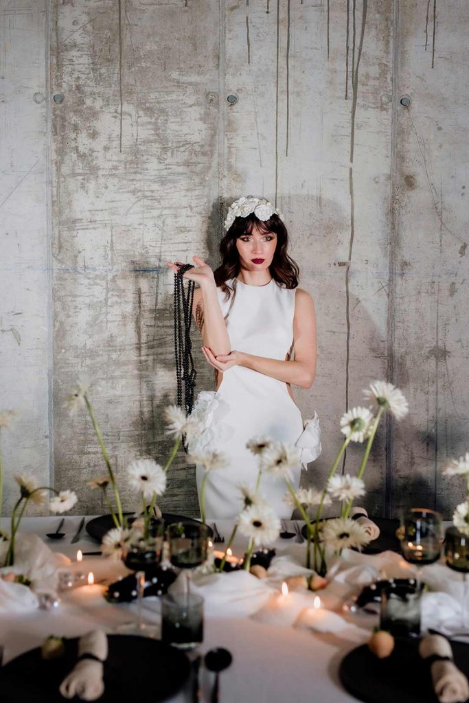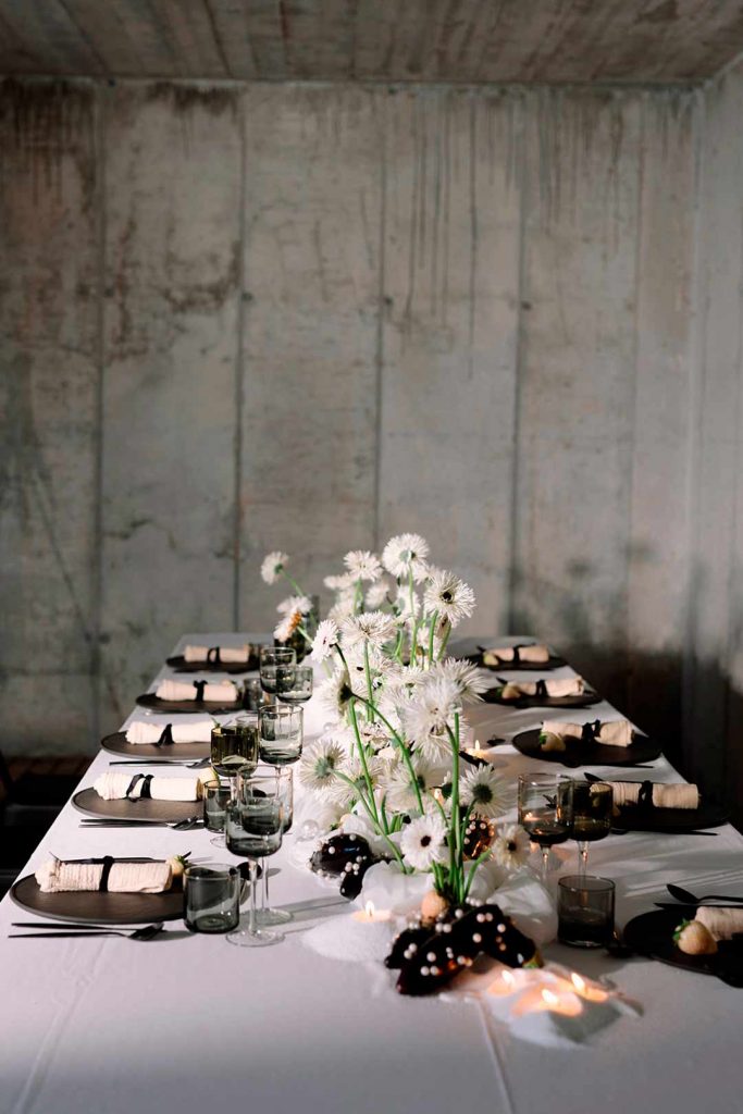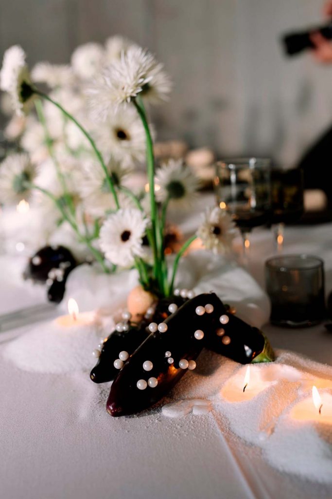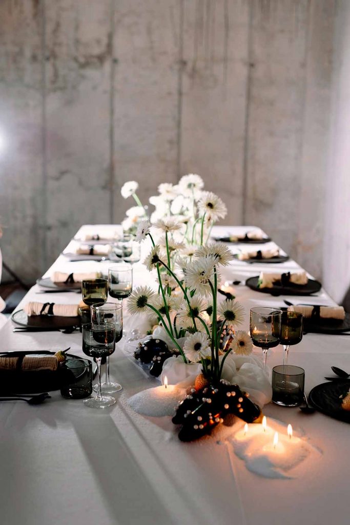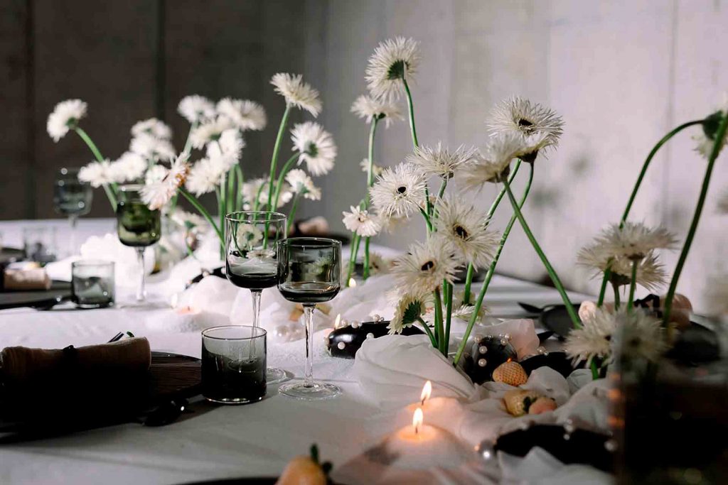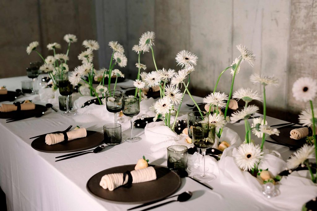 En el centro de mesa, las gerberas spider blancas y negras aportan una estética minimalista y contemporánea, mientras que las berenjenas negras decoradas con perlas blancas añaden un toque inesperado y vanguardista.
