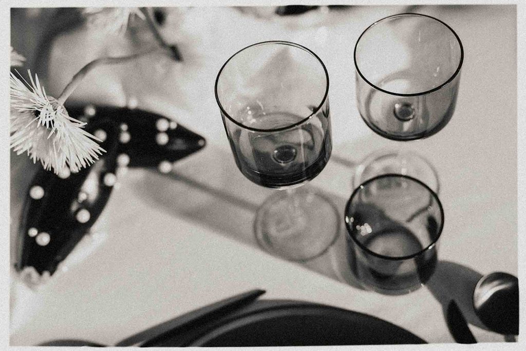 Cada detalle del menaje —vasos, platos y cubiertos— sigue la misma línea cromática para lograr una coherencia estética absoluta. El resultado es una mesa que fusiona simplicidad y arte, perfecta para bodas, celebraciones privadas o eventos corporativos que buscan una ambientación exclusiva.